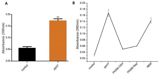 Activity of purified ppci1 and inhibition effect. (A) Activity of the ppci1 with the substrate compared with control (in the absence of ppci1). The asterisks ** represents a significant difference level of p < 0.001. (B) Effect of inhibitors (FK506-CSA, FK506-Rap and NEM).