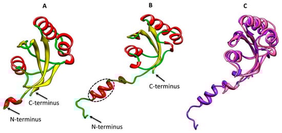 Structure prediction of ppci1 based on template (A) 3D structure of the template, red stands for alpha helices, yellow for sheets, and green for loops. (B) 3D predicted structure of ppci1. Predicted model contains one extra α-helix near the N-terminus (black circle). (C) Superposition model of ppci1: template (indigo) model (purple).
