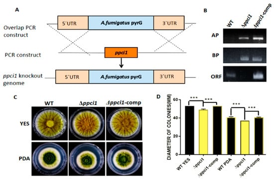 Construction of ppci1 deleted Δppci1, complemented Δppci1-comp strains and growth analysis. (A) Schematic diagram of gene deletion method. The fragments 5′UTR (Untranslated region) and 3′UTR were amplified with primers fused together AF/AR, BF/BR, pyrG-F/pyrG-R. (B) PCR confirmation of Δppci1 and Δppci1-comp strains with genomic DNA as a template (ORF) open reading frame, AP and BP fragments. (C) Phenotype analysis of WT, Δppci1 and Δppci1-comp strain grown PDA and YES medium at 37 °C for 5 d in the dark. (D) The asterisks ***means a significant difference (p < 0.01).