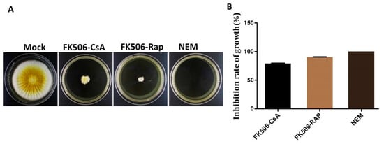 Effect of different inhibitors on the fungal growth. (A) Phenotype analysis of WT strain with the inhibitors Fk506-CsA, Fk506-Rapamycin and NEM at 37 °C for 5 d in the dark. (B) Inhibition rate of growth analysis with different drugs.