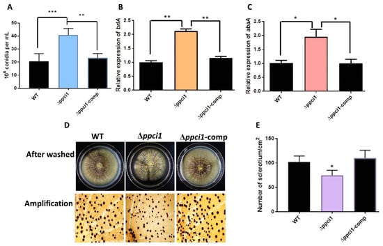To analyze the bio-function of ppci1 gene in conidiation, the strains (WT, Δppci1, and ppci1-Comp) were inoculated into YES medium, and cultured at 37 °C in the dark for 5 days. A quantitative analysis showed that Δppci1 produced a large number of conidiophores compared to WT and ppci1-Comp strains (Figure 8A). Moreover, a quantitative qRT-PCR was used to analysis the expression level of brlA and abaA, which were two conidia related transcriptional factor encoding genes and influence conidial formation []. The expression level of brlA was higher than abaA in the Δppci1 mutant compared with WT and ppci1–Comp strains (Figure 8B,C). In order to examine the effect of ppci1 on sclerotia formation in A. flavus, Wickerham (WKM) medium was inoculated with the all strains and cultured for 7 d at 37 °C in the dark. Then 70% ethanol was used to wash off aerial hyphae and conidia to visualize sclerotia, and the result demonstrated that the Δppci1 mutant displayed a significant reduction of sclerotia compared to WT and ppci1–Comp strains (Figure 8D,E). All these results demonstrated that ppci1 was involved in conidiation and sclerotia formation in A. flavus.