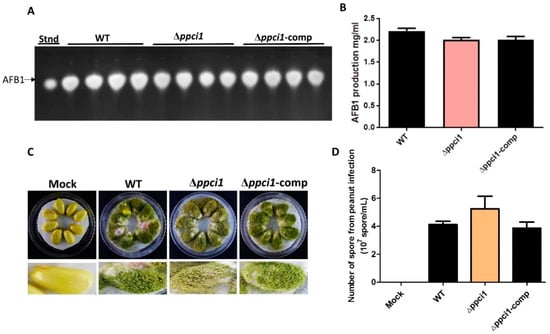 A. flavus is virulent, on the basis of aflatoxin production. To examine the effect of ppci1 on aflatoxin production, all the strains (WT, Δppci1, and ppci1-Comp) incubated in YES liquid medium at 29 °C in the dark. After 5 d incubation, mycotoxins were extracted and analyzed on TLC plate, which showed a slight decrease of aflatoxin production in Δppci1 strain compared to that of WT strain (Figure 9A,B). Furthermore, to examine the effect of ppci1 on pathogenicity in A. flavus, the WT, Δppci1 and ppci1–Comp strains were inoculated with peanut seeds. After 5 d of inoculation, spore productions in the infected seeds were examined. The deletion of ppci1 resulted in increased spore production compared to WT and Δppci1-Comp strains (Figure 9C,D). All these results demonstrated that ppci1 was not involved in Aflatoxin biosynthesis but might have an influence on pathogenicity to crop seeds in A. flavus.