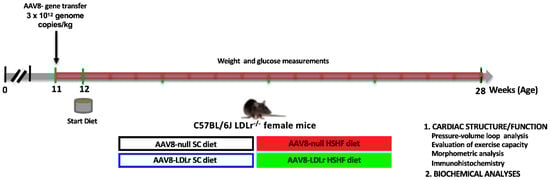 The global study design evaluating the effect of AAV8-LDLr gene transfer on the development of HFpEF in HSHF diet mice is illustrated in Figure 1. Gene transfer in female C57BL/6J LDLr−/− mice with the control vector AAV8-null or with AAV8-LDLr containing hepatocyte-specific transcriptional regulatory sequences to induce expression of the murine LDLr in parenchymal liver cells was performed at the age of 11 weeks. The high-sugar/high-fat (HSHF) diet was initiated in two groups one week later. The two other groups received a standard chow (SC) diet. Endpoint analyses in all groups were performed at the age of 28 weeks.