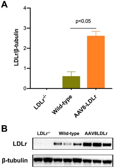 Murine LDLr expression in the liver of C57BL/6 LDLr−/− mice, wild-type C57BL/6J mice, and C57BL/6J LDLr−/− mice treated with 3 × 1012 genome copies/kg of AAV8-LDLr is illustrated in Figure 2. Murine LDLr was undetectable in C57BL/6J LDLr−/− mice. Murine LDLr expression 17 weeks after gene transfer with AAV8-LDLr in C57BL/6J LDLr−/− mice was 4.26-fold (p < 0.05) higher compared to wild-type C57BL/6J mice.