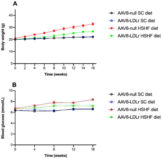 The time course of the body weight in SC-diet and HSHF-diet mice is shown in Figure 3A. Compared to AAV8-null SC diet mice, the body weight in AAV8-null HSHF diet mice was 1.16-fold (p < 0.0001) higher at 4 weeks, 1.28-fold (p < 0.0001) higher at 8 weeks, 1.38-fold (p < 0.0001) higher at 12 weeks, and 1.49-fold (p < 0.0001) higher at 16 weeks. AAV8-LDLr gene transfer did not affect body weight in SC diet mice but attenuated weight gain in HSHF diet mice. Body weight in AAV8-LDLr HSHF diet mice was reduced by 10.7% (p < 0.001) at 4 weeks, by 15.3% (p < 0.0001) at 8 weeks, by 16.6% (p < 0.0001) at 12 weeks, and by 18.7% (p < 0.0001) at 16 weeks compared to AAV8-null HSHF diet mice. Daily food intake measured during the entire duration of the experiment was not significantly different between AAV8-null HSHF diet mice (5.93 ± 0.37 g/mouse/day) and AAV8-LDLr HSHF diet mice (6.23 ± 0.33 g/mouse/day). The HSHF diet induced diabetes mellitus (Figure 3B). Blood glucose levels in AAV8-null HSHF diet mice were 1.26-fold (p < 0.0001) higher at 8 weeks and 1.26-fold (p < 0.0001) higher at 16 weeks compared to AAV8-null SC diet mice. Blood glucose levels in AAV8-LDLr HSHF diet mice were significantly lower at 8 weeks (p < 0.05), at 12 weeks (p < 0.05), and at 16 weeks (p < 0.0001) compared to AAV8-null HSHF diet mice.