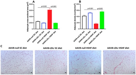 To evaluate the effect of AAV8-LDLr gene transfer on adiposity induced by the HSHF diet, a histological analysis of the gonadal fat pad was performed (Figure 4). The adipocyte cross-sectional area was 2.52-fold (p < 0.001) higher in AAV8-null HSHF diet mice than in AAV8-null SC diet mice. AAV8-LDLr gene transfer abrogated adipocyte hypertrophy induced by the HSHF diet (Figure 4A). The adipocyte cross-sectional area was reduced by 68.4% (p < 0.001) in AAV8-LDLr HSHF diet mice compared to AAV8-null HSHF diet mice. Adipocyte density was reduced by 59.5% (p < 0.001) in AAV8-null HSHF diet mice compared to AAV8-null SC diet mice and was not reduced at all in AAV8-LDLr HSHF diet mice.
