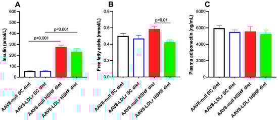 The HSHF diet induced hyperinsulinemia. Plasma insulin levels were 4.93-fold (p < 0.001) and 3.98-fold (p < 0.001) higher in AAV8-null HSHF diet mice and AAV8-LDLr HSHF diet mice, respectively, compared to respective SC diet groups (Figure 5A). Plasma free fatty acids (FFA) were 27.2% (p < 0.01) lower in AAV8-LDLr HSHF diet mice than in AAV8-null HSHF diet mice (Figure 5B). No significant differences of plasma adiponectin levels were observed (Figure 5C).