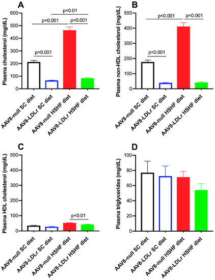 Lipid levels in SC diet mice and in HSHF diet mice are represented in Figure 6. Plasma cholesterol was 2.18-fold (p < 0.001) higher in AAV8-null HSHF diet mice compared to AAV8-null SC diet mice (Figure 6A). AAV8-LDLr gene transfer decreased plasma cholesterol by 68.6% (p < 0.001) and by 81.8% (p < 0.001) in SC diet mice and in HSHF diet mice, respectively. Plasma non-HDL cholesterol levels were increased by 2.32-fold (p < 0.001) in AAV8-null HSHF diet mice compared to AAV8-null SC diet mice (Figure 6B). Plasma non-HDL cholesterol levels were 77.8% (p < 0.001) and 89.8% (p < 0.001) lower in AAV8-LDLr SC diet mice and AAV8-LDLr HSHF diet mice, respectively, compared to respective AAV8-null groups. Plasma HDL cholesterol was 19.1% (p < 0.01) lower in AAV8-LDLr HSHF diet mice than in AAV8-null HSHF diet mice (Figure 6C). Plasma triglyceride levels were not significantly different between different groups (Figure 6D).