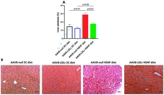 AAV8-LDLr gene transfer attenuates liver steatosis induced by the HSHF diet. Liver steatosis expressed as percentage of surface area in female C57BL/6J LDLr−/− mice at 16 weeks after the start of the diet is shown in panel (A). Data are expressed as means ± SEM (n = 5). Panel (B) contains representative photomicrographs illustrating hematoxylin- and eosin-stained liver tissue. The scale bar represents 50 µm.