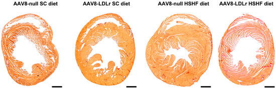 All experimental procedures in animals were executed in accordance with protocols approved by the Institutional Animal Care and Research Advisory Committee of the Catholic University of Leuven (Approval number: P191/2015, approval date: 5 November 2015) [52]. C57BL/6J LDLr−/− mice, originally purchased from Jackson Laboratories (Bar Harbor, ME, USA), were locally bred at the semi-specific pathogen free facility of the Catholic University of Leuven at Gasthuisberg. The study design is illustrated in Figure 1. All experimental mice were female and were fed a standard chow (SC) diet (Ssniff Spezialdiäten GmbH, Soest, Germany) or were fed the pellet form of TestDiet 58Y1/5APC (London, WC1N3XX, England, United Kingdom) starting at the age of 12 weeks. This experimental high-sugar/high-fat (HSHF) diet was maintained for 16 weeks. The composition of TestDiet 58Y1/5APC (HSHF diet) has been described before [53]. Metabolizable energy from the standard chow is 13.5 MJ/kg (9 kJ% fat, 24 kJ% protein, 67 kJ% carbohydrates), whereas metabolizable energy from the HSHF diet is 19.5 MJ/kg (46.4 kJ% fat, 17.6 kJ% protein, 36.0 kJ% carbohydrates). Mono- and disaccharides in the HSHF diet consisted of high-fructose corn syrup-55 (17.5%) and sucrose (17.5%) [53]. All four groups of mice (AAV8-null SC diet, AAV8-LDLr SC diet, AAV8-null HSHF diet, AAV8-LDLr HSHF diet) were analyzed at the age of 28 weeks. In the first experimental layer, mice were assigned for hemodynamic quantification and histochemical and immunohistochemical analysis. The second experimental layer consisted of mice that did not undergo perfusion fixation and that were used for the quantification of tissue and organ weights.