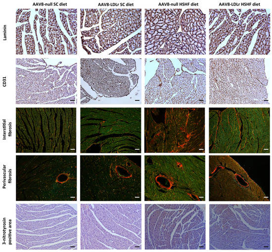 Morphometric analysis demonstrated that left ventricular wall area and anterior wall thickness in AAV8-null HSHF diet mice were 1.24-fold (p < 0.001) and 1.27-fold (p < 0.001) larger, respectively, than in AAV8-null SC diet mice (Table 2). Left ventricular wall area and anterior wall thickness in AAV8-LDLr HSHF diet mice were decreased by 13.8% (p < 0.01) and by 15.6% (p < 0.001), respectively, compared to AAV8-null HSHF diet mice. This was paralleled at the microscopic level by a significant (p < 0.001) increase of the cardiomyocyte cross-sectional area in AAV8-null HSHF diet mice compared to AAV8-null SC diet mice and a significantly (p < 0001) lower cardiomyocyte cross-sectional area in AAV8-LDLr HSHF diet mice than in AAV8-null HSHF diet mice. Moreover, the hypertrophy in HSHF diet mice was pathological as evidenced by the decrease of capillary density (p < 0.01) and relative vascularity (p < 0.01) and by the increased myocardial fibrosis (p < 0.001). Capillary density and relative vascularity were prominently (p < 0.01) increased in AAV8-LDLr HSHF diet mice compared to AAV8-null HSHF diet mice. Moreover, the degree of interstitial fibrosis and of perivascular fibrosis in AAV8-LDLr HSHD diet mice were 37.6% (p < 0.001) and 22.0% (p < 0.05) lower, respectively, in AAV8-LDLr HSHF diet than in AAV8-null HSHF diet mice (p < 0.001). Representative Sirius Red-stained cross-sections of SC diet and HSHF diet mice are shown in Figure 8. Laminin-stained cardiomyocytes, CD31-positive capillaries, Sirius Red-stained collagen viewed under polarized light, and immunosections stained for 3-nitrotyrosine in all four groups are illustrated by the representative photomicrographs in Figure 9. In aggregate, the HSHF diet leads to pathological remodeling, which is efficaciously antagonized by AAV8-LDLr gene transfer.