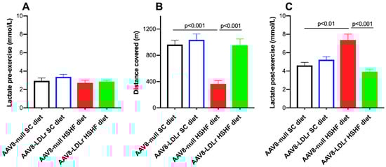 Exercise treadmill testing was applied to evaluate exercise capacity in the two SC diet groups and in the two HSHF diet groups (Figure 10A). The distance covered was reduced by 62.0% (p < 0.001) in AAV8-null HSHF diet compared to AAV8-null SC diet mice (Figure 10B). In contrast, the exercise capacity was completely normal in AAV8-LDLr HSHF diet, and the distance covered was 2.60-fold (p < 0.001) higher than in AAV8-null HSHF diet mice. Lactate post-exercise levels were 1.60-fold (p < 0.01) higher in AAV8-null HSHF diet than in AAV8-null SC diet mice (Figure 10C). A 46.9% (p < 0.001) reduction of lactate post-exercise levels was observed in AAV8-LDLr HSHF diet mice compared to AAV8-null HSHF diet mice.