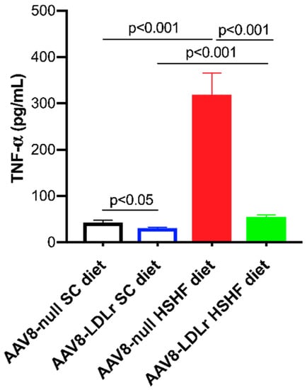 TNF-α may play a role in the progression of heart failure. Plasma levels of TNF-α were 7.38-fold (p < 0.001) higher in AAV8-null HSHF diet than in AAV8-null SC diet mice (Figure 11). An 82.7% (p < 0.001) reduction of plasma TNF-α was observed in AAV8-LDLr HSHF diet mice compared to AAV8-null HSHF diet mice (Figure 11).