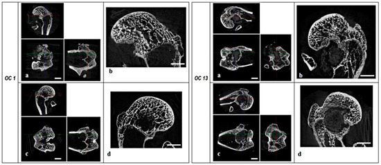 RegenOss (left panel) and experimental group (right panel) micro-CT sections. Organization of each panel: (a) Micro-CT sections of the right leg samples in the axial, sagittal, and coronal planes, scale bar 5 mm; (b) Lateral condyle sagittal micro-CT section (right leg samples), scale bar 3 mm; (c) micro-CT sections of the left leg samples in the axial, sagittal, and coronal planes, scale bar 5 mm; (d) lateral condyle sagittal micro-CT section (left leg samples), scale bar 3 mm.