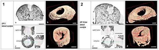Micro-CT sections and 3D models of samples of control (1) and experimental group (2) in sheep. Each panel showed: (a) Condyle sagittal Micro-CT section, scale bar 5 mm; (b) 3D model of peri-implant trabecular bone in TV2, scale bar 3 mm; (c) micro-CT sections in axial, sagittal, and coronal planes of TV1, scale bar 3 mm; and (d) 3D model of the new bone formed into TV1, scale bar 3 mm.