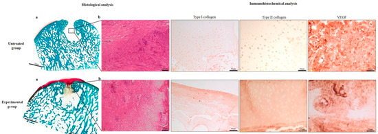 Histological evaluations at six months in the untreated group: (a) No evidence of bone and cartilage defect healing, Safranin-O/Fast green stain. Magnification 1×. (b) Presence of fibrous tissue in the defect area. H/H staining: Magnification 20×. In the experimental group: (a) Safranin-O/Fast green stain. Magnification 1×. (b) Cartilage defect filled with fibrous tissue resembling fibrocartilage. H/H staining: Magnification 20×. The immunohistochemical panel showed the staining for type I, type II collagen, and VEGF. Magnification 10×.