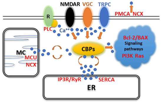 Figure 1. Signaling of EF-hand Ca2+-binding buffer proteins (CaBPs) shows a central role in Ca2+ maintenance. Effects of G-protein-coupled phospholipase C (PLC), N-methyl-D-aspartate receptors (NMDARs), voltage-gated calcium channels (VGCs), and transient receptor potential cation channels (TRPCs) can be buffered by CaBPs. Intracellular Ca2+-dependent signal transduction is significantly controlled by CaBPs. This Ca2+ originates from mitochondria (MC) and endoplasmic reticulum (ER). Mitochondrial calcium uniporter (MCU), inositol trisphosphate receptor, ryanodine receptor (IP3R/RyR), and sarco and endoplasmic reticulum Ca2+-ATPase (SERCA) control Ca2+ levels intracellularly, while the sodium–calcium exchanger (NCX) can also be found on the MC and cell membranes. Plasma membrane Ca2+-ATPase (PMCA) and NCX are responsible for the removal of Ca2+ from the cell.