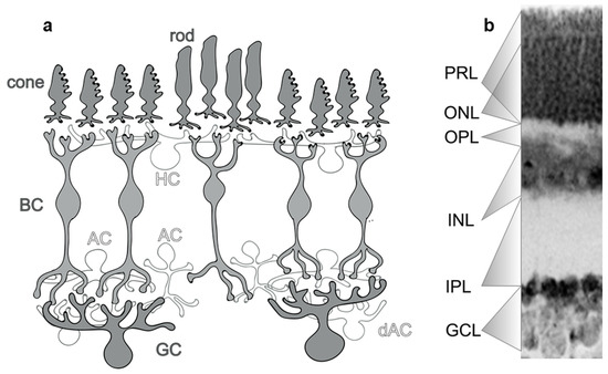 Figure 2. General structure of the mammalian retina. (a) The mammalian retina is a structurally complex multi-layered organ built from five major classes of neurons, namely, photoreceptors (PR), bipolar cells (BC) and ganglion cells (GC) that provide parallel pathways; and horizontal (HC) and amacrine cells (AC; and dAC for displaced amacrine cells) which are responsible for maintaining lateral inhibitory synapses in the outer and inner retina, respectively. Based on the localization of each cell type, the retina can be divided into well-defined anatomical layers, including the ganglion cell layer (GCL), the inner plexiform layer (IPL), the inner nuclear layer (INL), the outer plexiform layer (OPL), the outer nuclear layer (ONL) and the photoreceptor layer (PRL). (b) These layers are visible on a fluorescent Nissl-stained mouse retinal optical section (whole thickness: 200 µm).