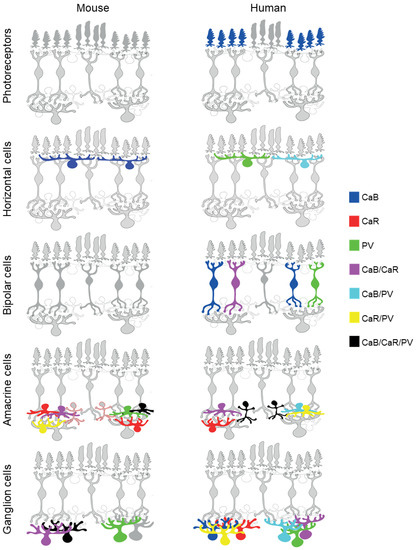 Akin to other CNS loci, CaBPs have been shown to be widely expressed by neurons of the mammalian retina as well. In fact, there have been numerous approaches to reveal the identity of the diverse CaBP-expressing neuronal subtypes in retinas of various mammalian model species and the human tissue as well. CaBPs are divided into well-conserved protein families: annexins, pentraxins, C2-domain proteins, EF-hand proteins, vitamin-K-dependent proteins and the intraorganellar low-affinity, high-capacity Ca2+-binding proteins [1]. However, only a few members of the EF-hand family (parvalbumin—PV; calbindin—CaB; calretinin—CaR; the Ca2+ sensor calmodulin—CaM) and proteins of the S100 family are used as neuronal markers in the retina [2].