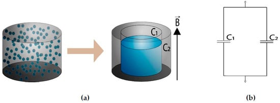(a) Restructuring of the ferromagnetic filler in a magnetoactive elastomers (MAE) and (b) the corresponding equivalent circuit proposed in []. C1 denotes the polymer capacitance over the compacted filler, while C2 stands for the capacitance of the rest of the polymer matrix. The filler is assumed to be a perfect electrical conductor.