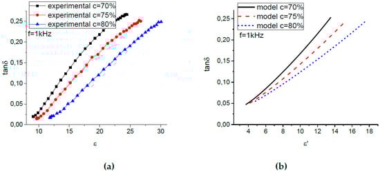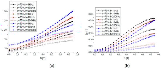 The influence of the filler content on the permittivity and dielectric loss of the material is of a contrary kind, namely, while the value of ε′ increases with increasing filler concentration, the value of tanδ decreases with it. This means that the filler concentration has a larger influence on the permittivity rather than the electrical conductivity of the composites. On the other hand, at a fixed concentration of magnetic particles, the magnetic field has a larger effect on the electrical conductivity rather than the permittivity of MAEs. A similar conclusion was drawn from the results reported in [].