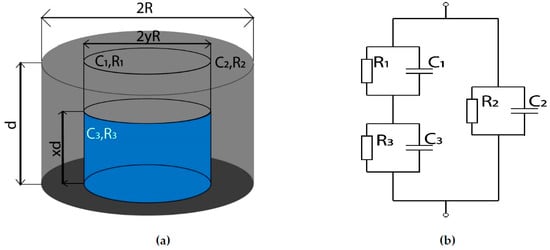 If an external magnetic field is applied to the MAE, ferromagnetic filler particles will preferably re-arrange along magnetic-field lines, and this will influence the dimensions of the equivalent cylinder, i.e., the values of all the circuit parameters. The highly conductive phase has constant volume (as the number of particles cannot change) but variable geometrical parameters (see Figure 3a). The total height of the sample is denoted d, and x·d is the height of the equivalent agglomerate. The diameter of the sample is 2R, and the diameter of the equivalent agglomerate is 2yR. Obviously, 0 < x,y < 1. The external magnetic field is directed along the axis of the cylinder. We expect elongation of the equivalent agglomerate along the magnetic field; hence, x must be a monotonously increasing function of magnetic flux density B. Additionally, the following relation must be fulfilled: