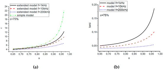 Figure 4 shows theoretical dependences of the permittivity and the loss tangent on the phenomenological parameter x of our model, which describes magnetic particle restructuring with magnetic field. For comparison, the theoretical results of the model proposed in [] are plotted by the dash-dotted line in Figure 4a. One can see that both models predict an increase in ε′ with the increasing auxiliary parameter x, i.e., with growing magnetic field. However, the simple model of [] (where the filler is an ideal electrical conductor) cannot describe any variation of tanδ with x; it is always the dielectric loss of the polymer matrix there. Furthermore, in contrast to the simplest model [], the improved theoretical description can correctly reproduce the frequency dependence of both ε′ and tanδ.