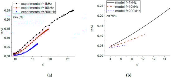 Direct comparison of the theoretical dependences and the experimental results shown in Figure 4 is not possible, because the inter-relation between the phenomenological parameter x and the value of the external magnetic field is unknown. A possible solution is to exclude the unknown parameter x from consideration and compare directly the theoretical and experimental results in terms of tanδ versus ε′ values. The corresponding tanδ(ε′) curves are plotted in Figure 5 for MAEs containing various concentrations of particles and in Figure 6 for the MAE75-sample measured at various frequencies. Figure 5a and Figure 6a show the experimental results, while the model dependences are plotted in Figure 5b and Figure 6b. One can see that the theory gives us quite satisfactory agreement with the experimental results. Indeed, the model describes well an increase of the permittivity of the composites with the amount of magnetic filler, a growth of the dielectric loss with ε′, as well as a more pronounced dependence of tanδ on ε′ for lower frequencies.