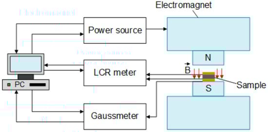 The experimental setup for dielectric measurements is sketched in Figure 7. MAE samples were placed between round electrodes forming a capacitor. The gap between electrodes was fixed during the measurements to 1.00 ± 0.01 mm, so that samples could be slightly squeezed. The diameter of electrodes was 20.0 ± 0.1 mm. The magnetic field from an electromagnet (model EM2, MAGMESS Magnet-Messtechnik Jürgen Ballanyi e.K., Bochum, Germany) was applied perpendicular to the plane of the sample. To ensure the homogeneity of an applied magnetic field, the electromagnet poles had a diameter of 10 cm, which is much larger than the capacitor’s diameter. The total height of the measurement cell was 31 mm, and the gap between electromagnet poles was 35 mm. The magnetic field was measured using the Lakeshore gaussmeter 455 DSP with the Hall sensor head HMMT-6J04-VR (Lake Shore Cryotronics, Inc., Westerville, OH, USA). The drive current I was generated by the power supply EA-PSI 8160-60 2U (EA Elektro-Automatik, Viersen, Germany). The measurements were performed in the stationary regime when the electric current was stable, i.e., the transients from switching disappeared. The magnetic field magnitude was varied between 0 and 750 mT.