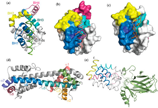 In the context of the three-dimensional structure of Bcl-xL, the BH domains make essential contributions to its tertiary structure (Figure 1a,b). The BH1 and BH2 domains encompass turn regions linking two helices, α4 to α5 (in the case of BH1) and α7 to α8 (in the case of BH2). The BH3 domain is located entirely on α2 whilst the BH4 domain is located on α1 and makes a number of stabilising hydrophobic contacts with α2, α5, and α6.