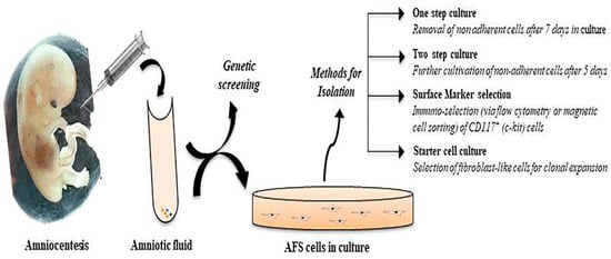 Amniocentesis is routinely performed between 16–18 weeks of pregnancy. The collected amniotic fluid is used for prenatal genetic testing and as a source of AFS cells. Different approaches and protocols have been used to isolate AFS cells [,,]. These isolation protocols can be distinguished into i) a one-step culture protocol; in this procedure the primary amniocyte culture is left undisturbed for seven [,] to twenty [] days without any changes in the medium; ii) a two-step culture protocol; in this approach the non-adherent amniocytes are collected on the fifth or seventh day after isolation and kept until further analysis is completed. After that, the cells are cultured in the appropriate medium [,]; iii) a procedure where the amniocytes are selected for a specific marker, for example for CD117 (c-Kit receptor) [,] and iv) a short-term culture method; specimens are centrifuged and incubated in Mesencult or Chung medium. After three days, non-adherent cells are discarded, and fresh medium is added. Thereafter cells can be cultured [] or clonally expanded [] (Figure 1).