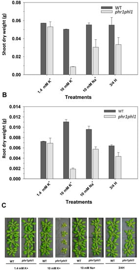 To study the interactions between K+ and Pi nutrition, the effect of different K+ concentrations on plant growth of WT and phr1phl1 plants was studied. The phr1phl1 mutant line lacks the PHR1 and PHL1 transcription factors, which are central pieces of plant response to Pi deficiency []. Plants were grown under control conditions (1/5 Hoagland solution) for 33 days and then transferred for 7 days to nutrient solution containing 0.2 mM Pi and two K+ levels, 1.4 and 10 mM. It was observed that the presence of 10 mM KCl in the external solution significantly reduced shoot and root growth of phr1phl1 plants, 84% and 72% respectively (Figure 1A,B). Growth in the presence of 10 mM KCl also reduced growth of WT shoots, although to a much lesser extent, which was not statistically significant (12%) (Figure 1A), and significantly increased WT root growth (Figure 1B).