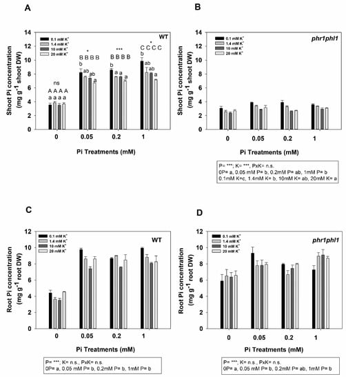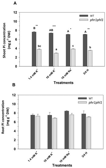 Because the phr1phl1 line is impaired in Pi nutrition, and high K+ produced a specific reduction of its growth, the internal Pi and K+ concentrations of the plants exposed to the above treatments were determined. It was observed that, in general, phr1phl1 plants showed significant reduction in their shoot Pi in comparison to WT plants (Figure 2A), consistent with their deficient Pi nutrition []. Within phr1phl1 plants, the 10 mM K+ treatment produced a significant decrease in shoot Pi concentration. Shoot Pi concentrations of WT plants were barely affected by the different treatments (Figure 2A). Regarding roots, similar Pi concentrations were found in WT and phr1phl1 plants. Although it was not statistically significant, the 10 mM K+ treatment produced the lowest root Pi concentrations in phr1phl1 plants (Figure 2B).