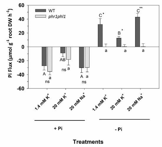 Pi fluxes in Pi-sufficient and Pi-starved plants from a 30 µM external Pi in the absence or the presence of 1.4 mM KCl, 10 mM KCl or NaCl. Plants of WT (dark grey bars) and phr1phl1 mutant (light grey bars) were grown for 33 days in a control 1/5 Hoagland solution containing 0.2 mM Pi and then transferred for 7 days to the same solution (+Pi) or a solution without Pi (−Pi). Then, plants were incubated for 8 h in nutrient solution with 30 µM Pi in the absence or in the presence of 10 mM KCl or 10 mM NaCl. Samples of this external solution were taken at different time points to determine their Pi concentration. Flux rates of Pi were calculated from the variation in external Pi per h and per g of root dry weight. Shown are average Pi fluxes of three repetitions and errors bars denoted standard error. ANOVA was used to study the effects of the treatment (T), the genotype (G), and their interaction (TxG) resulting in: (A) T = ***, G = *** and TxG = *. Bars with different letters within lines denote significant differences according to Tukey test (uppercase letters for WT and lowercase letters for phr1phl1 line). Differences between genotypes within the same treatment were analyzed according to ANOVA., **, * indicate significant differences at p < 0.01 and 0.05 respectively, n.s. indicates non-significant at p > 0.05.