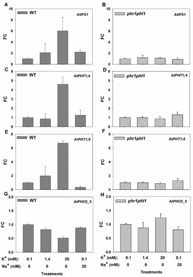 The effects of high external K+ or Na+ on the expression of the genes encoding root Pi uptake systems induced by Pi starvation, AtPHT1;4 and AtPH1;8, were studied. The AtIPS1 gene, encoding a non-coding RNA, and the PHO2, encoding an E2 conjugase, were also chosen for this study as they are important pieces of the signal cascade induced by Pi deprivation []. Plants were grown in control solution for 33 days and then for 7 days in solutions containing 0.05 mM Pi in the presence of 0.1, 1.4, or 20 mM KCl, or 20 mM Na+. After these treatments roots were collected to determine gene expression by real time PCR. In WT plants, 20 mM K+ induced 4.8-fold the AtIPS1 gene (Figure 5 A), 7.6-fold the AtPHT1.4 gene (Figure 5C), and 8.8-fold the AtPHT1.8 gene (Figure 5E) with respect to the control treatment (0.1 mM K+). By contrast, 20 mM Na+ had no effect. These treatments produced no effect on the expression of these genes in the phr1phl1 background (Figure 5B,D,F). The expression of the AtPHO2_5 gene was repressed by increasing external K+ (Figure 5G) and it was barely affected by the presence of 20 mM Na+ in WT plants. In phr1phl1 plants, AtPHO2_5 expression was not affected by the treatments (Figure 5H). Finally, the response to 20 mM external K+ or Na+ of the genes encoding the PHR1 and PHL1 transcription factors was also determined in WT plants. While the expression of PHL1 (Figure 6B) was not affected by the treatments, increasing external K+ slightly increased PHR1 expression (Figure 6A).
