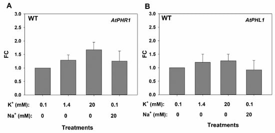 Effects of external K+ and Na+ on the expression of the AtPHR1 (A) and AtPHL1 (B) genes. Plants of WT were grown and processed as described in Figure 5. Then roots were harvested and their total RNA extracted to synthesize cDNA that was used for real time PCR determinations of gene expression by the ∆∆Ct method. Shown are the averages of three repetitions for the Fold-Change of gene expression with respect to the calibrator sample corresponding to the 0.1 mM KCl treatment.