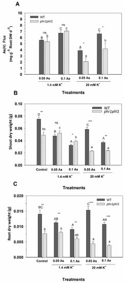 As(V) fluxes and shoots and roots dry weights of plants exposed to different concentrations of As(V) and K+. Plants of WT (dark grey bars) and phr1phl1 mutant (light grey bars) were grown for 33 days in a control 1/5 Hoagland solution containing 0.05 mM Pi and then transferred for 1 day to solutions containing 0.05 mM Pi with 0.05 or 0.1 mM As(V) in the presence of 1.4 or 20 mM K+. Then shoots and roots were harvested, dried at 65 °C, acid digested, and their arsenic concentrations determined by ICP spectrometry. The arsenic fluxes (A) were calculated from the arsenic accumulation in the plant per day and gram of root dry weight. The average shoot (B) and root (C) dry weights of these plants are shown. Shown are the averages of three repetitions and error bars denote standard error. ANOVA was used to study the effects of the treatment (T), the genotype (G) and their interaction (TxG), resulting in: (A) T = ***, G = * and TxG = *. Bars with different letters within lines denote significant differences according to Tukey test (uppercase letters for WT and lowercase letters for phr1phl1 line). Differences between genotypes within the same treatment were analyzed according to ANOVA. * indicate significant differences at p < 0.05 and n.s. indicates non-significant at p > 0.05. (B,C). T= ***, G = *** and TxG = ***. Bars with different letters within lines denote significant differences according to Tukey test (uppercase letters for WT and lowercase letters for phr1phl1 line). Differences between genotypes within the same treatment were analyzed according to ANOVA. ***, **, * indicate significant differences at p < 0.001, 0.01 and 0.05 respectively and n.s. indicates non-significant at p > 0.05.
