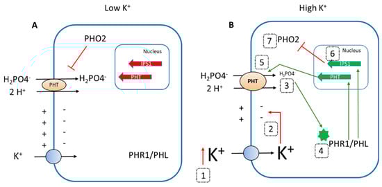 Induction of Phosphate Starvation Respones (PSR) by high external K+. The figure shows a simplified proposed model for the mechanism involved in the induction of the PSR by high external K+. Shown are key elements of the PSR that have been characterized in the present study. (A) Under low K+, a non-depolarized membrane potential drives the uptake of H2PO4− through the PHT symporter, the cell does not detect Pi deficient, the PHR1 and PHL1 transcription factors are not activated, the transcription of Phosphate Transporters (PHT) is not induced, and the PHO2 conjugase also reduces their activity. (B) In the presence of high external K+ (1, red upward arrow), K+ uptake depolarizes the plasma membrane potential (2, red arrow), reducing the driving force for H2PO4− and its accumulation in the cell (3). This partial Pi deficiency activates (green arrow) the PHR1 and PHL1 transcription factors (4) that induce the transcription of the PHT genes encoding Pi uptake systems (5, green arrow) and of the non-coding RNA IPS1 (6, green arrow) that indirectly reduces the accumulation of the PHO2 transcript (7), releasing the negative regulation of PHO2 on PHT transporters. The PHT and IPS1 genes are represented by red wide arrows when not induced and by green wide arrows when induced.