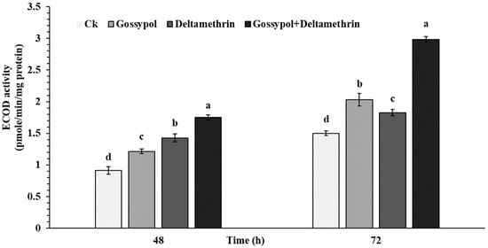 It has been demonstrated that enhanced activity of detoxification P450 enzymes represents an important biochemical mechanism which metabolizes a wide array of toxic compounds including plant secondary metabolites and pesticides in phytophagous insects []. For example, numerous studies have revealed that the midguts and fat bodies of insect larvae play a dominant role in xenobiotic metabolism, and, therefore, detoxification activities of P450 enzymes may be highly expressed in these organs [,]. In this study, our results indicated that higher activity of the P450 detoxification enzyme was found in S. exigua larvae exposed to gossypol+deltamethrin after 48 and 72 h (Table 2). The results of the current study support previous work on various phytophagous insects, e.g., Spodoptera liture [], H. armigera [], who found that the acquired resistance of the plant defense chemicals is positively correlated with the resistance to some insecticides. In addition, exposure to PBO, an important P450 synergist can inhibit the activity of P450 enzymes in phytophagous insects [,,]. In this investigation, PBO showed synergetic effects on the toxicity of deltamethrin to the gossypol-fed larvae of S. exigua, thus, the results of the P450 synergist suggested that resistance to gossypol and deltamethrin is P450-mediated. Building on this evidence, these data suggest that the increased tolerance in S. exigua may result from the ability of these plant allelochemicals to induce detoxification enzymes, mainly P450s, which may contribute to the adaptation of polyphagous herbivores to the diverse allelochemicals encountered from their broad range of host plants.