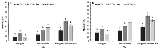Target genes dsCYP6AB14+dsCYP9A98 combination was prepared at the final concentration of 1000 ng/µl. After combined application of dsRNA, the larval mortality was significantly increased which showed 23.33%, 36.66%, and 48.33% for gossypol, deltamethrin, and gossypol+deltamethrin, respectively at 48 h compared with the ds-RED which showed 8.33%, 16.66%, and 26.66% for the same treatments (Figure 5). Similarly, mortality of S. exigua larvae fed on dsCYP6AB14+dsCYP9A98 following the exposure to gossypol, deltamethrin, and gossypol+deltamethrin was significantly increased after 72 h showing the mortality rate for gossypol, deltamethrin, and gossypol+deltamethrin of 36.33%, 63.33%, and 81.66%, respectively, compared with the ds-RED as a control treatment (Figure 5). In the end, the data showed a fascinating combined effect of dsCYP6AB14+dsCYP9A98 on the mortality of S. exigua larvae.