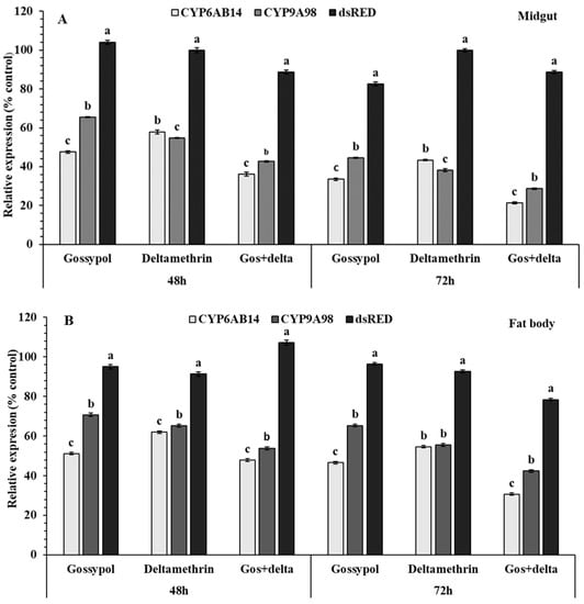 To determine whether reduced expression of dsCYP6AB14 and dsCYP9A98 have an effect on the susceptibility of S. exigua larvae to gossypol and deltamethrin, RNAi-mediated knockdown effect of these genes was performed on fourth instar larvae of S. exigua exposed to gossypol and deltamethrin. Twenty-four-hour post-treatment to dsRNA via droplet feeding following exposure on gossypol, deltamethrin, or gossypol+deltamethrin led to significant reductions in the expression levels of dsCYP6AB14 and dsCYP9A98 in the midgut and fat bodies at 48 and 72 h, respectively (Figure 6). Furthermore, QRT-PCR results showed that droplet feeding of the combined target genes (dsCYP6AB14+dsCYP9A98) significantly reduced the relative expression levels than the ds-RED control or the individual dsRNA treatments in the midguts and fat bodies after 48 and 72 h (Figure 6). This result validated that RNAi effectively suppressed the expression of CYP9A105 in S. exigua exposed larvae under the conditions employed.