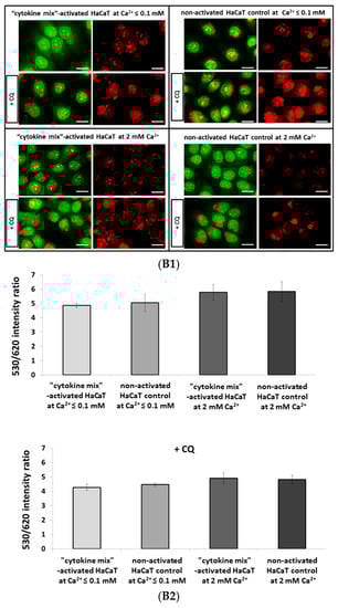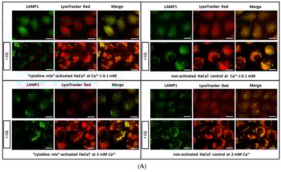 Fluorescence microscopy analysis of lysosomal compartments and other acidic vesicles in keratinocytes. Shown are representative microscopy images of HaCaT cells: (i) Activated with “cytokine mix”: interleukin 1 alpha (IL-1α), IL-17A, IL-22, oncostatin M (OSM), and tumor necrosis factor alpha (TNF-α) at a concentration of 2 ng/mL each constituent and cultured in medium containing Ca2+ ≤ 0.1 mM; (ii) non-activated HaCaT cell control cultured in medium containing Ca2+ ≤ 0.1 mM; (iii) “cytokine mix”-activated HaCaT cells cultured in medium containing 2 mM Ca2+; and (iv) non-activated HaCaT cell control cultured in medium containing 2 mM Ca2+. Control with chloroquine (CQ) was used to increase the total amount of lysosomes. All images were captured from randomly selected ten microscopic fields containing 50–100 cells, each from three independent experiments (n = 3), using a fluorescence microscope. Scale bar represents 0.25 µm. (A) LysoTracker Red DND-99 staining showing the distribution of acidic organelles, including mature lysosomes and lysosomal-associated membrane protein 1 (LAMP1) staining of the lysosomal membrane. (B1) Lysosomal membrane permeabilization detection and visualization of acidic vesicles (AVOs) loaded with acridine orange (AO). DNA and RNA are stained green by acridine orange and healthy lysosomes are stained red. Upon exposure to chloroquine (positive control for lysosomal membrane permeabilization), lysosomes increase in size and stain green and yellow, indicating lysosomal swelling. (B2) Acridine orange assay measuring fluorescence intensity emission at 530 and 620 nm following excitation at a wavelength of 490 nm. The 530/620 nm ratio indicates cytoplasm to acidic vesicle rate. Each treatment was performed in 20 wells. Data represent the mean values ± standard deviation (SD) from n = 3.