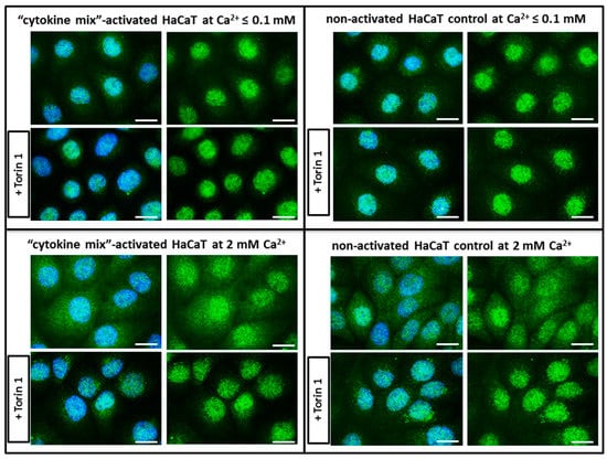The results described above prompted examination of the alterations in the subcellular localization of endogenous TFEB, a master regulator of lysosome biogenesis and function. Among the acidic vesicles, the number of lysosomal compartments increased quantitatively in condition which mimics the psoriatic status, i.e., in response to keratinocyte activation. To test the potential role of TFEB-mediated lysosomal arrangement in the “psoriasis-like” inflammation phenotype of keratinocytes, TFEB cytoplasm-to-nucleus shuttling under proinflammatory cytokine-activated and non-activated conditions was evaluated in in vitro HaCaT cultures. Additional control assays were conducted with cells cultured in medium containing a high concentration of Ca2+ (2 mM). Interestingly, it was noted that in keratinocytes grown in medium containing a low concentration of calcium (Ca2+ ≤ 0.1), TFEB translocated from a diffuse cytoplasmic location to the nucleus, at a level comparable to the selective inhibitor of mammalian target of rapamycin (mTOR) kinase (Torin 1) positive control, regardless of whether the keratinocytes were activated psoriatically. Such an effect was not seen when the keratinocytes were cultured in medium containing a high concentration of calcium ions (Figure 2). Therefore, it was concluded that the calcium ions, rather than “cytokine-mix” stimulation, was responsible for this phenomenon.
