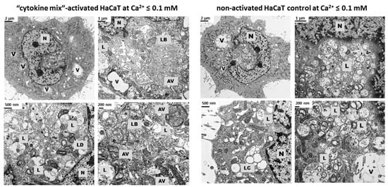 Transmission electron microscopy (TEM) micrographs showing the ultrastructure of HaCaT cells activated with proinflammatory cytokines (“cytokine mix”) and cultured in medium containing Ca2+ ≤ 0.1 mM vs. the non-activated keratinocyte control cultured in medium containing Ca2+ ≤ 0.1. Representative images were collected from at least 30 cells obtained from three independent cell cultures (n = 3). Scale bars are shown on each image. Abbreviations: N—nucleus; —autophagosomal vacuoles; L—lysosomes; LB—lamellar bodies; LC—carbohydrate-storing lysosomes; LD—lysosomes of amorphous flocculent and electron-dense structure; and V—vacuoles.
