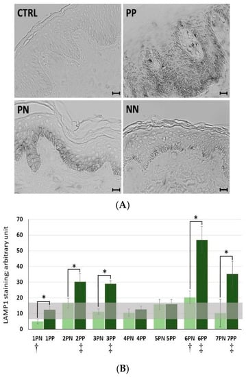 Skin biopsies with a minimum diameter of 3 mm (two clippings in the study group of 7 subjects (numbered from 1 to 7): From the psoriatic plaque and the non-lesioned skin; and one clipping in the control group of 4 healthy individuals (numbered from 1 to 4)) were taken from the buttocks, fixed with 4% PFA in PBS, and embedded in paraffin. Subsequently, 5 µm-thick sections were mounted on Superfrost adhesive slides (Fisher Scientific, Hampton, NH, USA), and the epitopes were exposed by boiling in a 10-mM citric acid solution (pH 6.0). Endogenous peroxidase activity was inhibited using 3% hydrogen peroxidase in methanol for 5 min. Sections were blocked with 10% goat serum/1% BSA in PBS for 1 h and stained with mouse anti-LAMP1 (eBioH4A3, Invitrogen, Thermo Fisher Scientific; 5 µg/mL) in 1% BSA for 1 h at RT. Sections were subsequently washed in PBS and incubated with a biotinylated goat anti-mouse IgG secondary antibody (Vector Laboratories Inc, Burlingame, CA, USA; 4 µg/mL) in 10% normal goat serum (Vector Laboratories Inc)/1% BSA in PBS for 45 min at RT. Finally, an anti-biotin tertiary antibody (VECTASTAIN Elite ABC-Peroxidase Kit, Vector Laboratories Inc) was added for 30 min according to the manufacturer’s instructions. The reaction was developed using DAB substrate (Vector Laboratories Inc) according to the manufacturer’s instructions. For quantification analysis, nickel was added to the DAB substrate to obtain black staining. A non-specific mouse IgG was used as a control in place of the primary antibody. All comparative sections were performed at the same time under identical conditions. Images were taken using an IX51 Olympus inverted light microscope (Olympus, Tokyo, Japan) with a color CCD camera and the cellSens imaging software (ver 1.12, Olympus). Comparative images were taken under the same light conditions and processed in the same way.