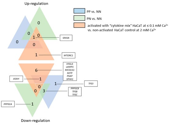 Genes with changes in expression identified via real-time qRT-PCR (0.7 ≥ FC ≥ 1.3) in the HaCaT cells with “psoriasis-like” inflammation and skin specimens of psoriasis patients 8 to 18, respectively, with the corresponding overlap between the datasets. The number in each triangle represents the amount of up- and down-regulated genes in the different comparisons: “cytokine mix”-activated HaCaT cells cultured in medium containing a Ca2+ concentration ≤0.1 mM vs. non-activated HaCaT cell control cultured in medium containing 2 mM Ca2+ (orange triangle); PP vs. NN skin (blue triangle); and PN vs. NN skin (green triangle). PP—psoriatic plaque; PN—psoriatic normal; NN—non-psoriatic normal (from healthy individuals 5 to 15).