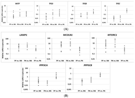 For the majority of patients (both PP and PN skin specimens), the MTORC1 gene was overexpressed, while the PPP3CA and PPP3CB genes were down-regulated, which may result in decreased expression of genes belonging to the MiT family. Despite this, the LAMP1 and MCOLN1 genes had high FCs (in 82% of patients, including PP and PN skin), which may indicate that the number of lysosomes was increased but their biogenesis was independent of the MiT family. A comparable expression profile for PP vs. NN and PN vs. NN demonstrates that the above changes occur prior to the onset of the characteristic disease phenotype.