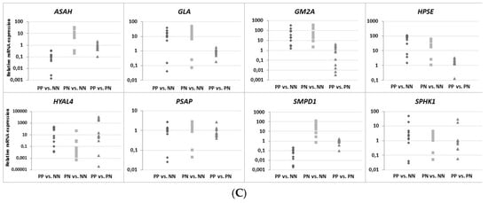 Real-time qRT-PCR verification of microphthalmia family (MiT family) genes (A: MITF, TFE3, TFEB, and TFEC); lysosomal marker genes and those encoding factors that control the lysosomal biogenesis process (B: LAMP1, MCOLN1, MTORC1, PPP3CA, and PPP3CB); and genes encoding lysosomal enzymes (C: ASAH, GLA, GM2A, HPSE, HYAL4, PSAP, SMPD1, and SPHK1) in skin specimens. The relative mRNA expression levels were determined against that of GAPDH (glyceraldehyde-3-phosphate dehydrogenase), and the relative quantitation was calculated using 2−ΔΔCt and compared between each group (PP—psoriatic plaque vs. NN—non-psoriatic normal, PN—psoriatic normal vs. NN, and PP vs. PN). Scatter plots showing the relative expression levels of genes, each with number of patients n = 11 (psoriasis patients 8 to 18) for PP/PN and n = 11 (healthy individuals 5 to 15 as a control) for NN.