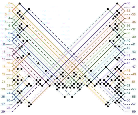 There is a fixed periodic sequence of period 60 whose rule is given in Figure 3, which, when started from a seed encoding an integer x in binary with at most bits for some k, folds into a structure encoding , , …, , on the successive rows of the triangular grid.