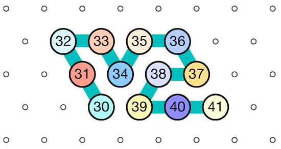 A configuration c of a sequence is a self-avoiding path of length labelled by w in , i.e., a path whose vertices are pairwise distinct and labelled by the letters of w. We denote by the bead-type of the i-th bead of c. A partial configuration of a sequence w is a configuration of a prefix of w. For any partial configuration c of some sequence w, an elongation of c by k beads is a partial configuration of w of length . We denote by the set of all partial configurations of w (the index w will be omitted when the context is clear). We denote by the set of all elongations by k beads of a partial configuration c of a sequence w and by the singleton containing the prefix of length of c.